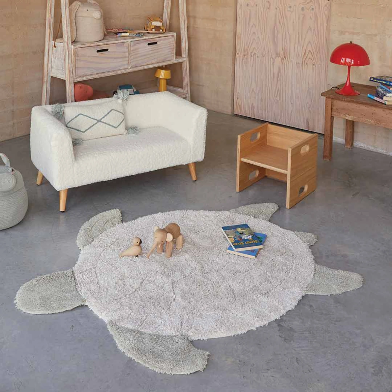 Alfombra de algodón, lavable en lavarropas patrón hexagonal, imita el caparazón geométrico de una tortuga marina. ¡Un nuevo amigo para la habitación de tu hijo.