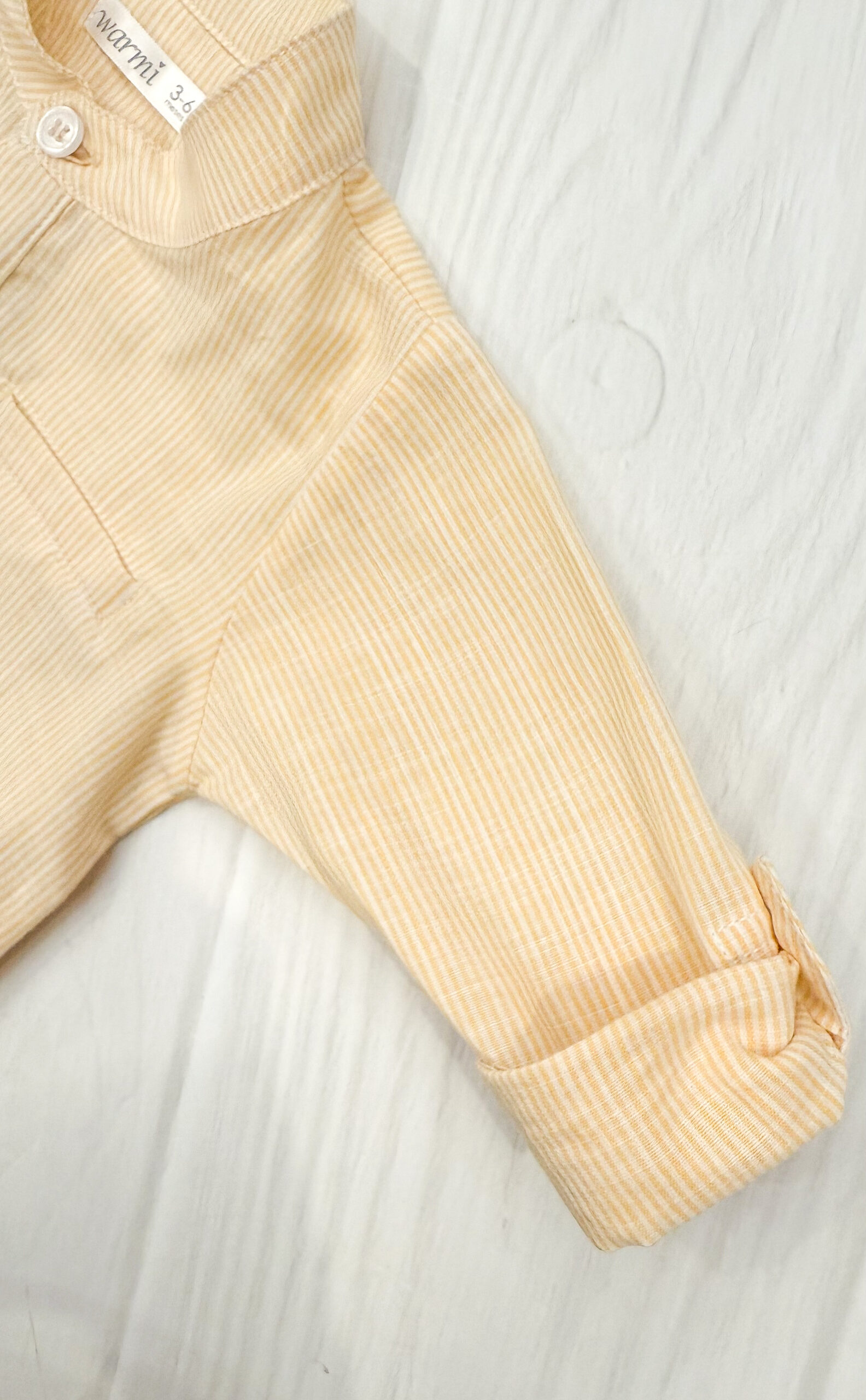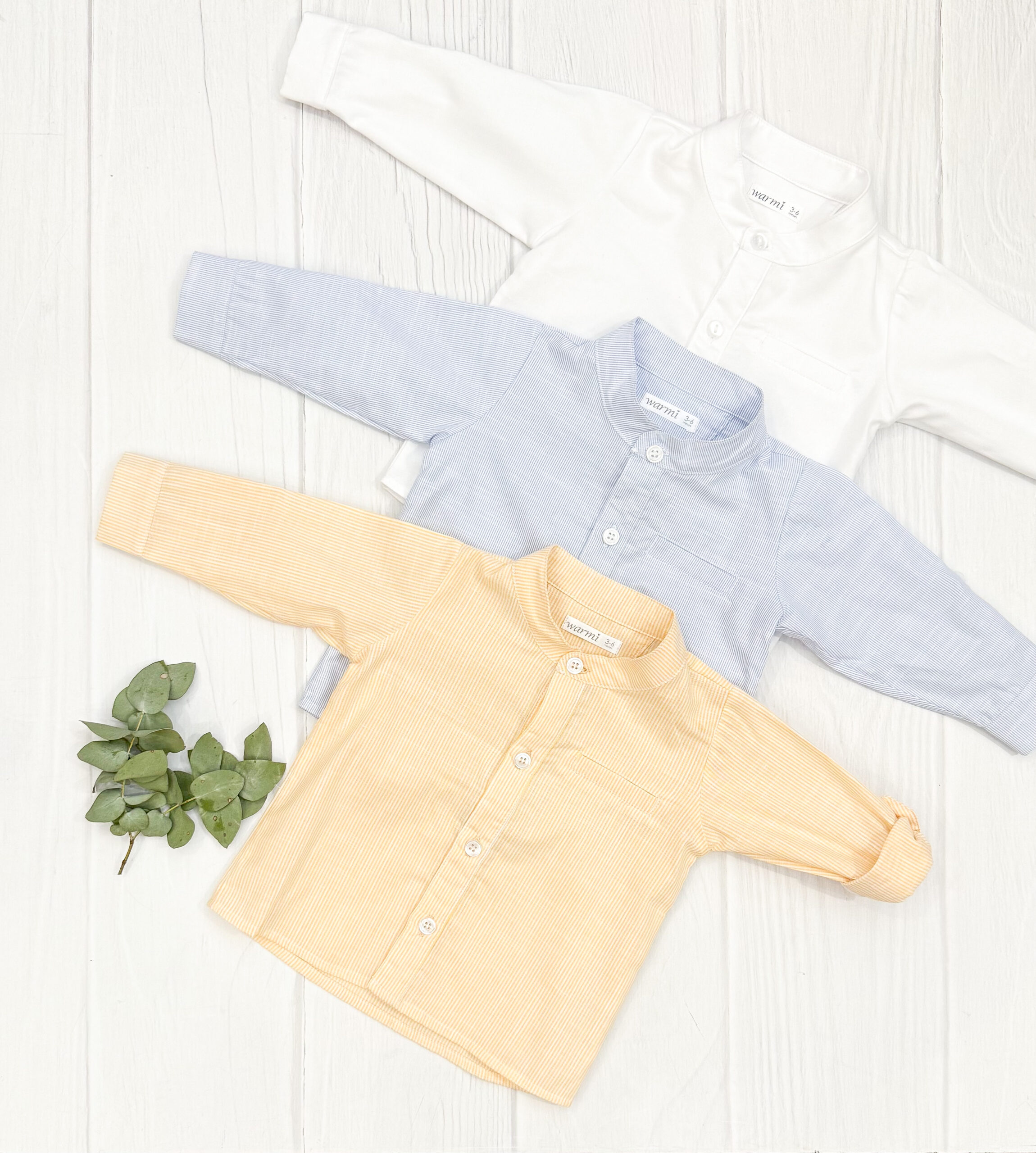 Camisa César cuello mao listrada con botón en mangas para regular en blanco, raya amarilla o raya celeste, disponible en talles 3-6/6-12/12-18 meses y 2-4/4-6/6-8/8-10 años.