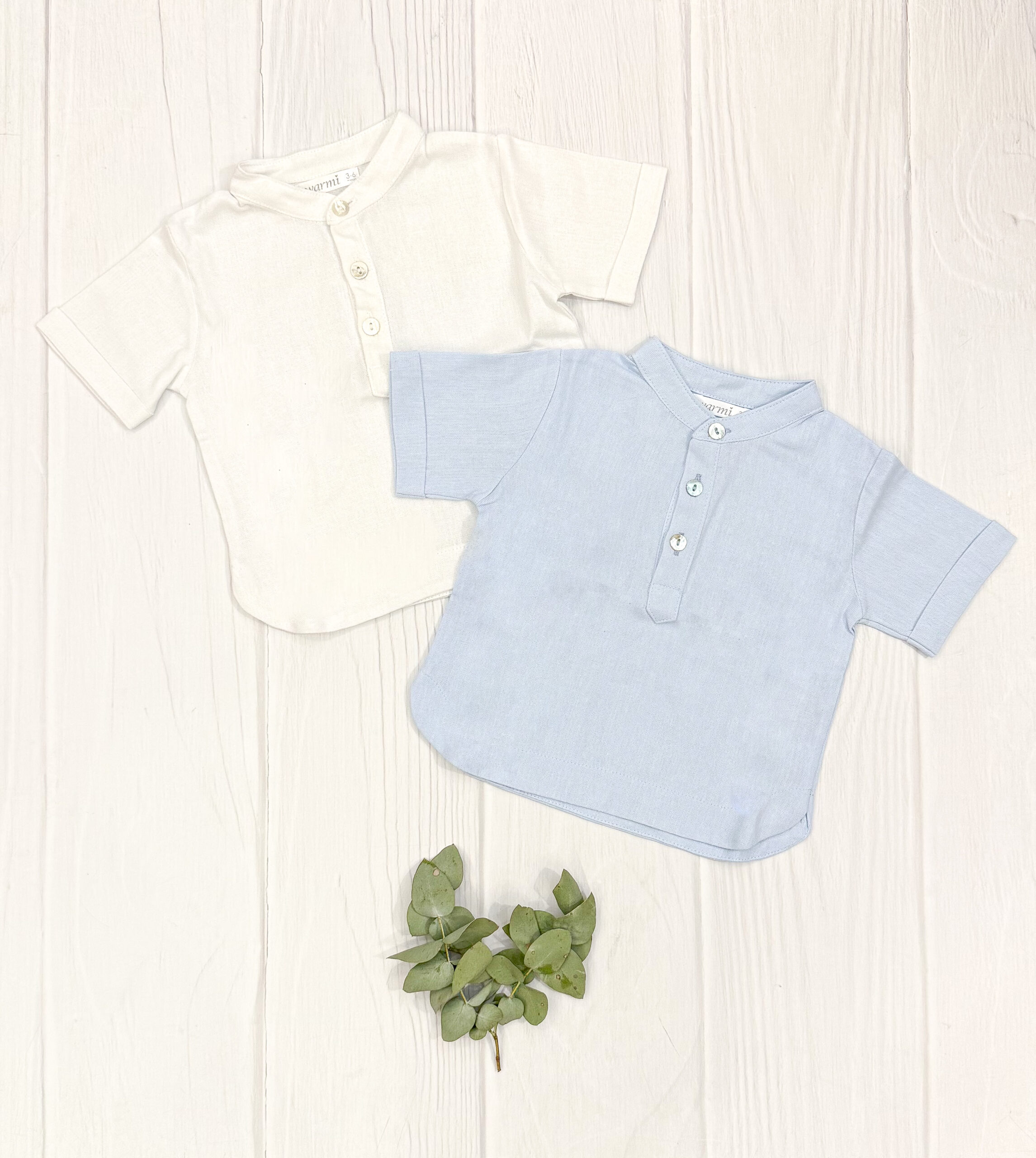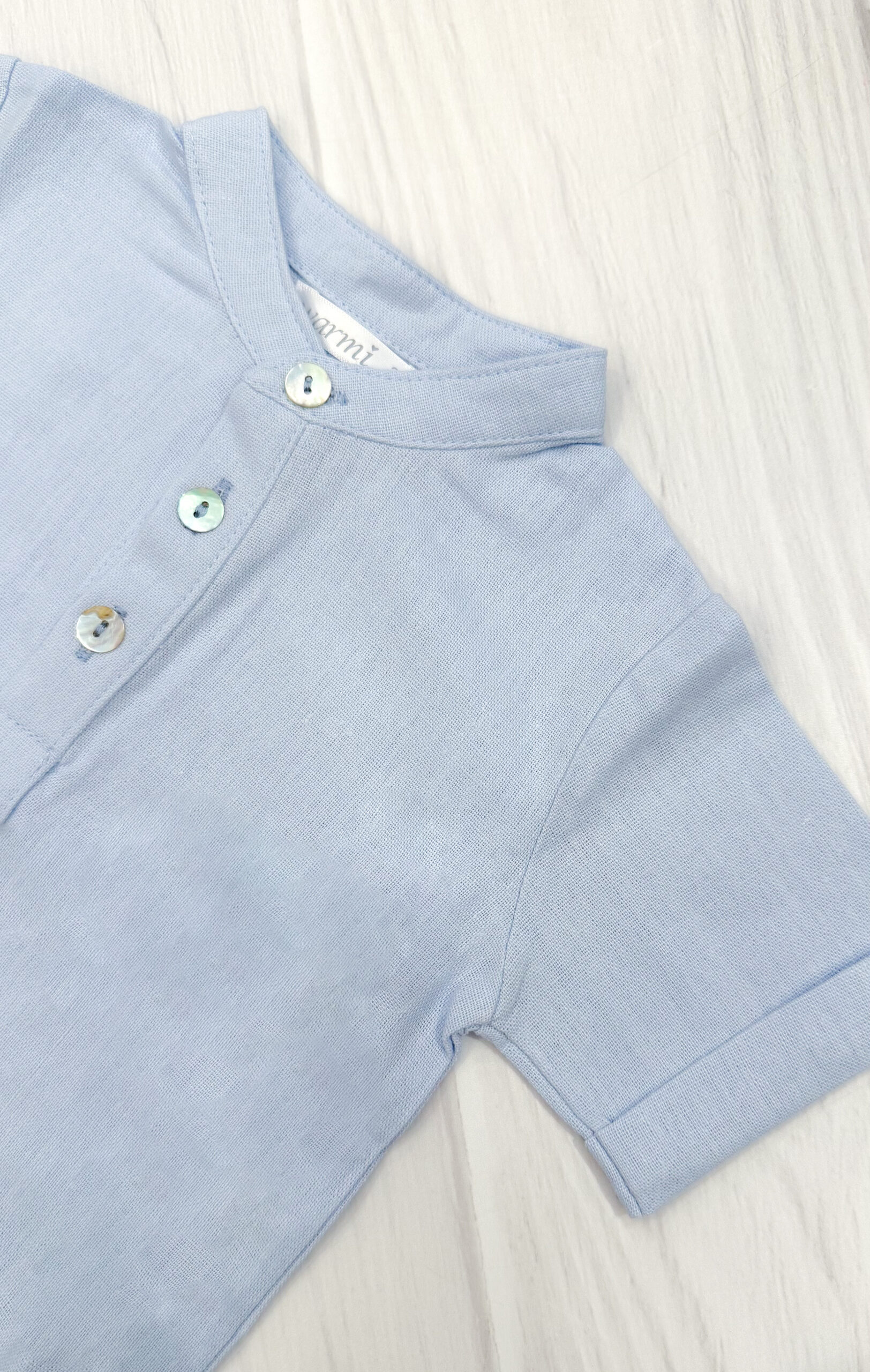 Camisa Mao en lino 100% algodón manga corta en blanca o celeste, disponible en talles 3-6/6-12/12-18 meses y 2-4/4-6/6-8/8-10 años.
