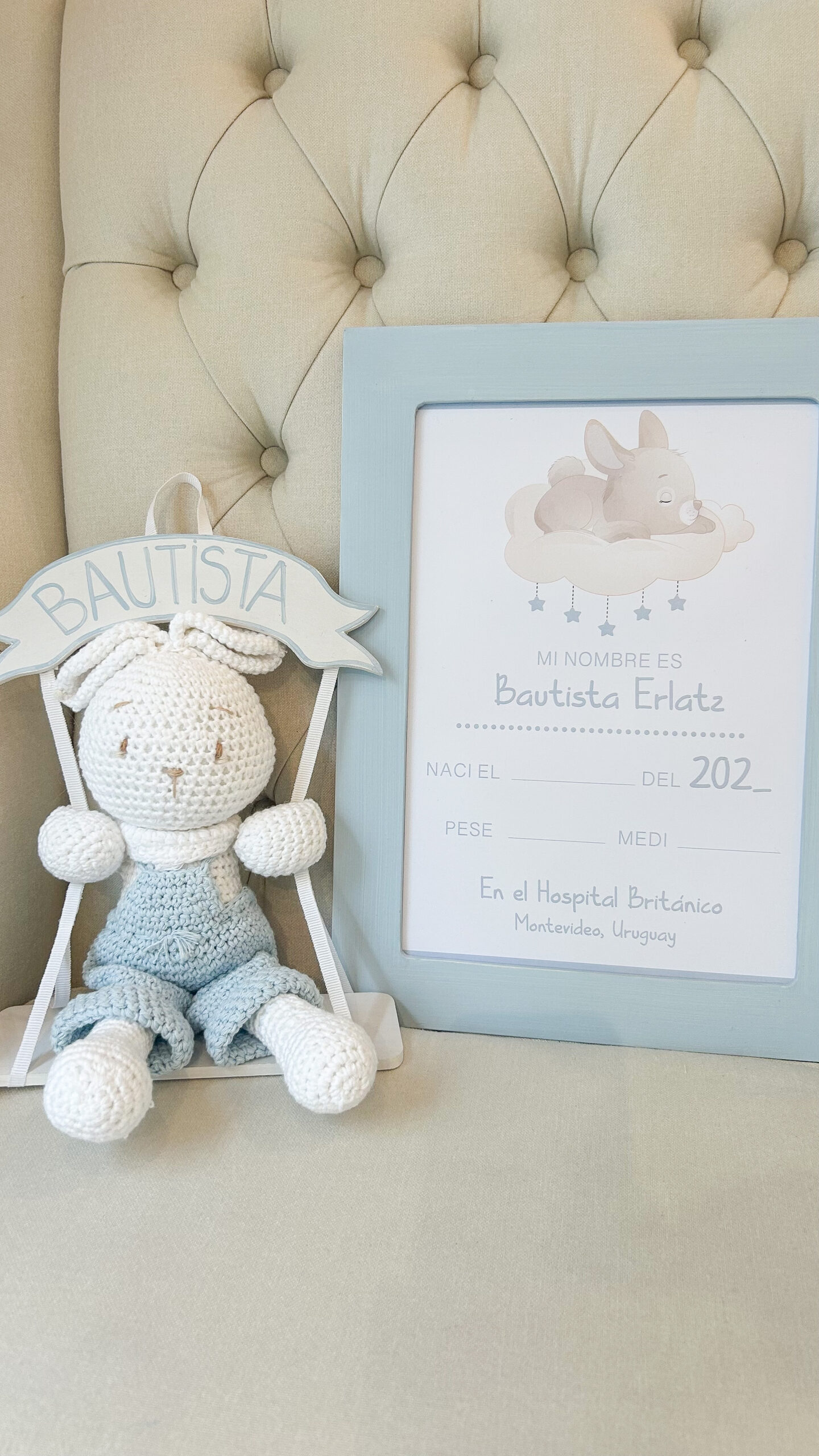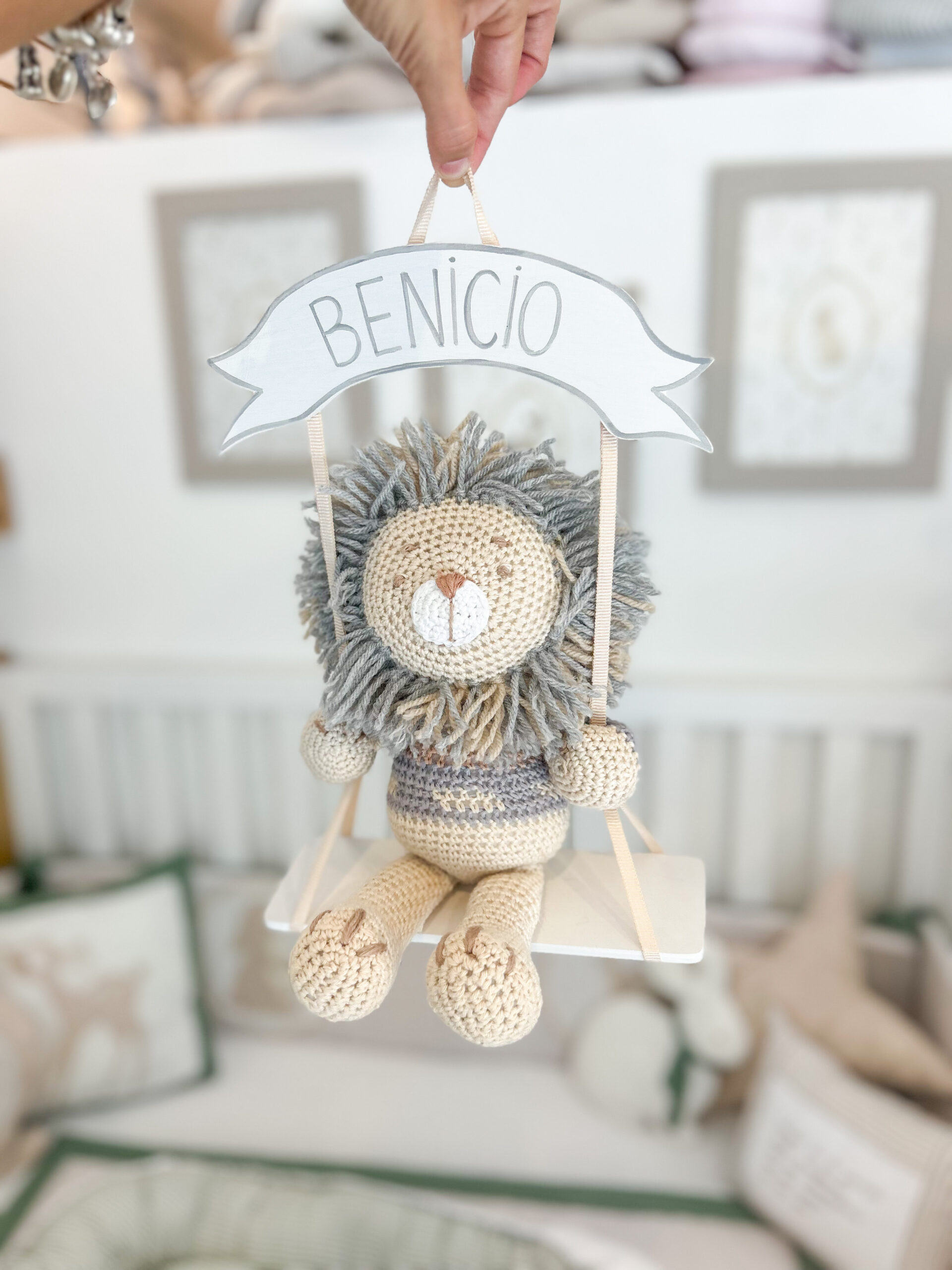 Cartel hamaca con muñeco tejido en tonos de preferencia.