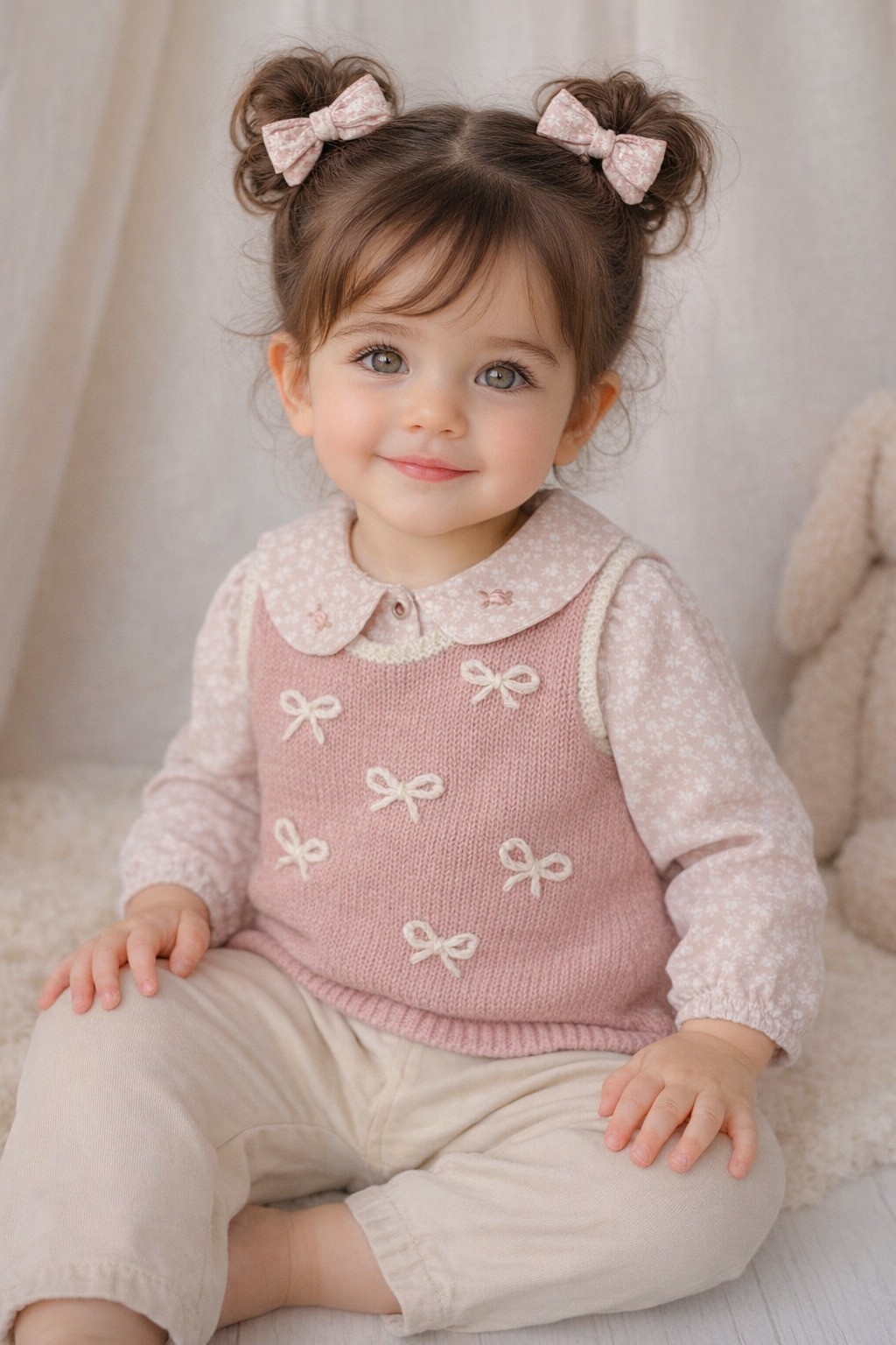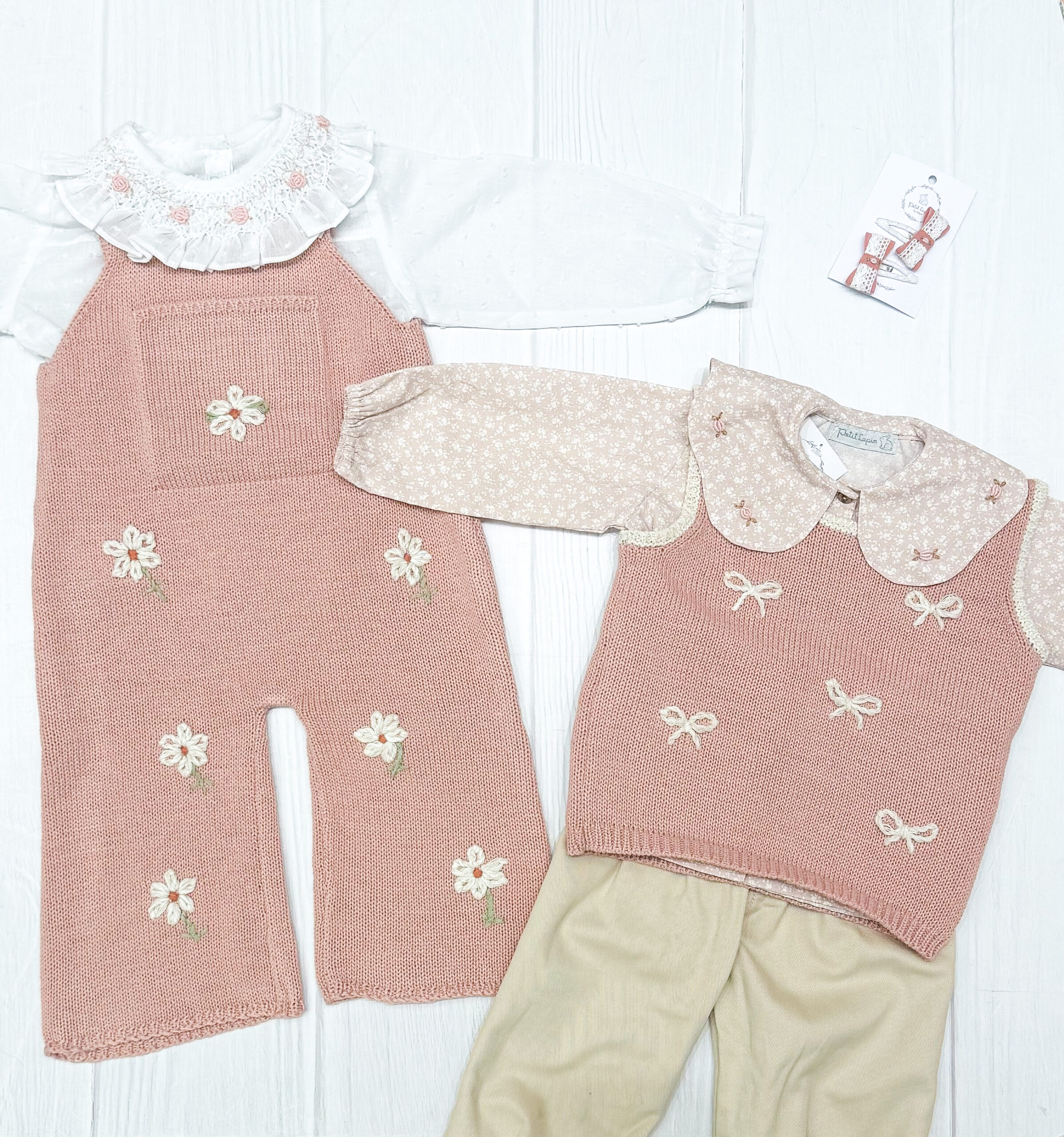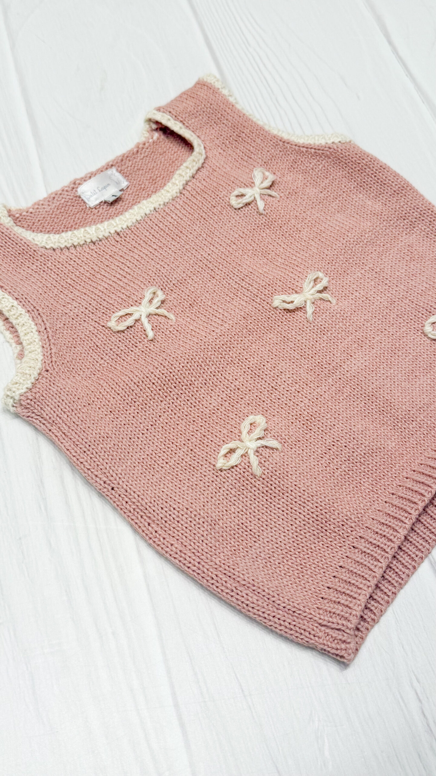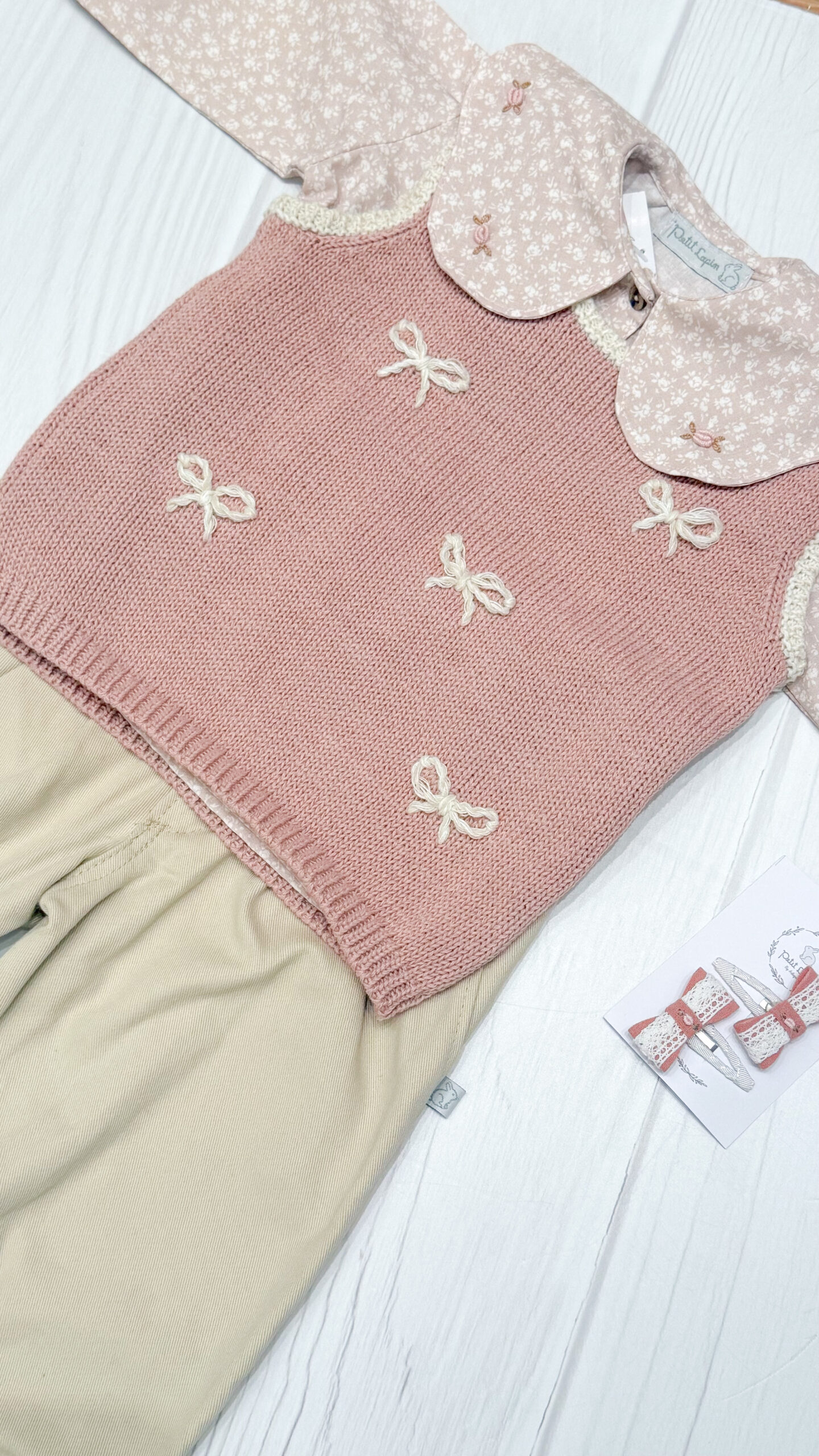 Chaleco tejido en dralon modelo Lourdes, en rosa viejo con apliques de flores.