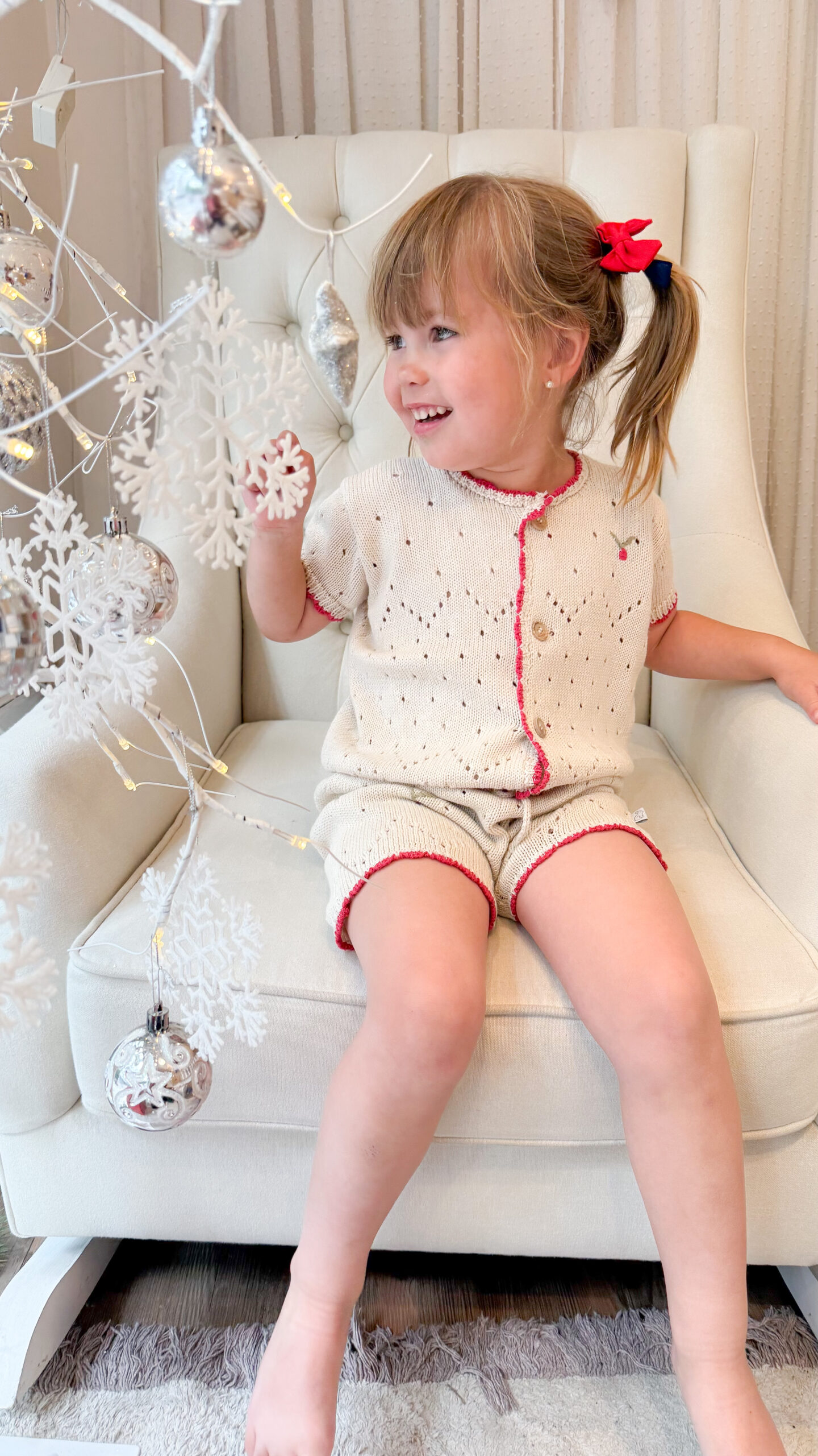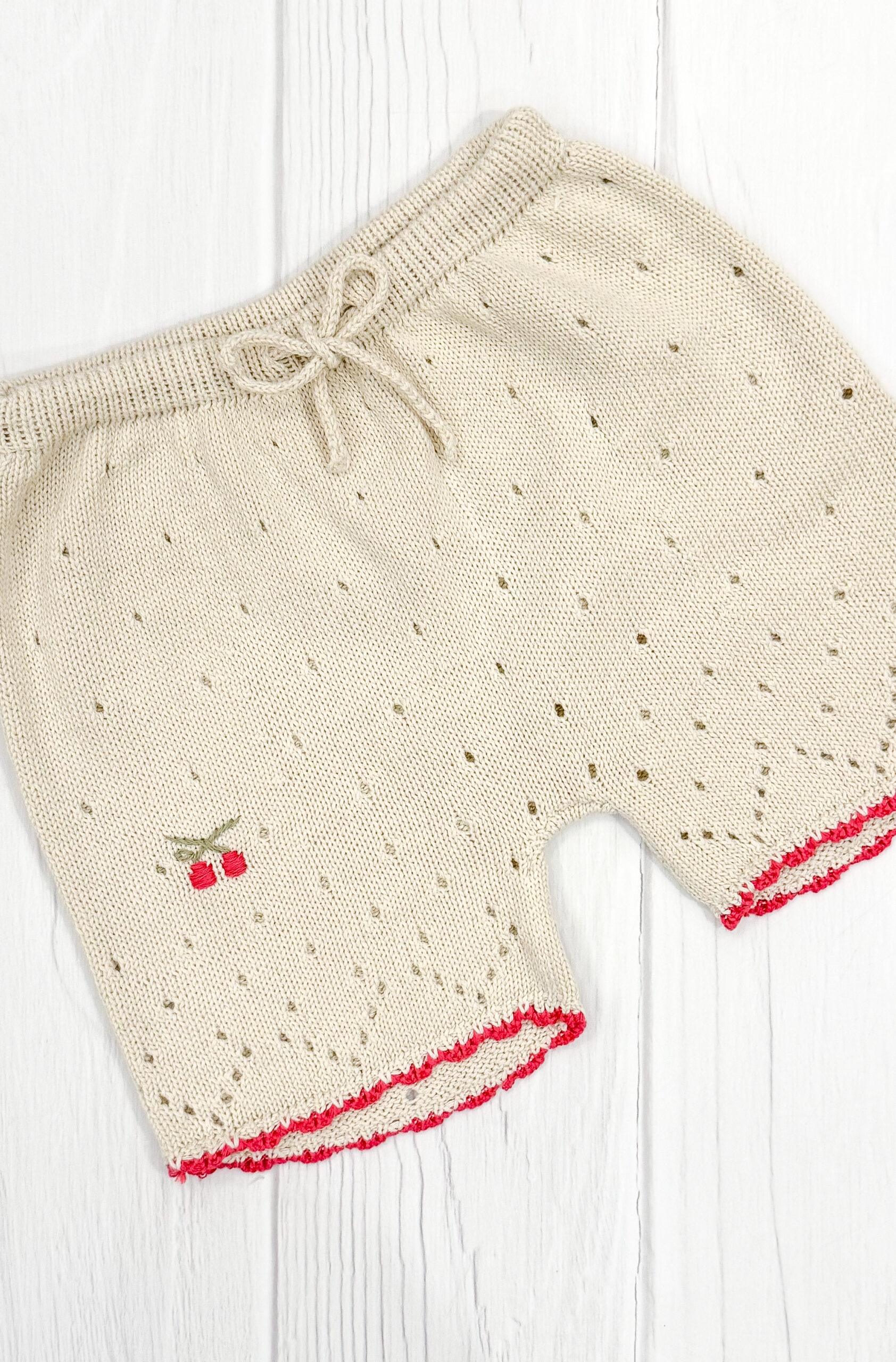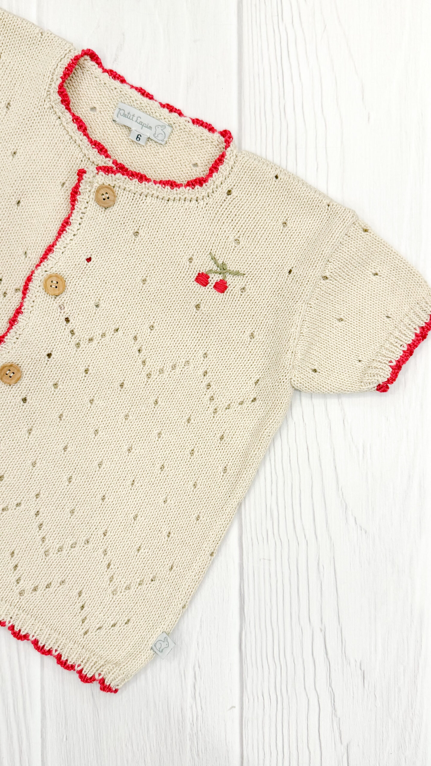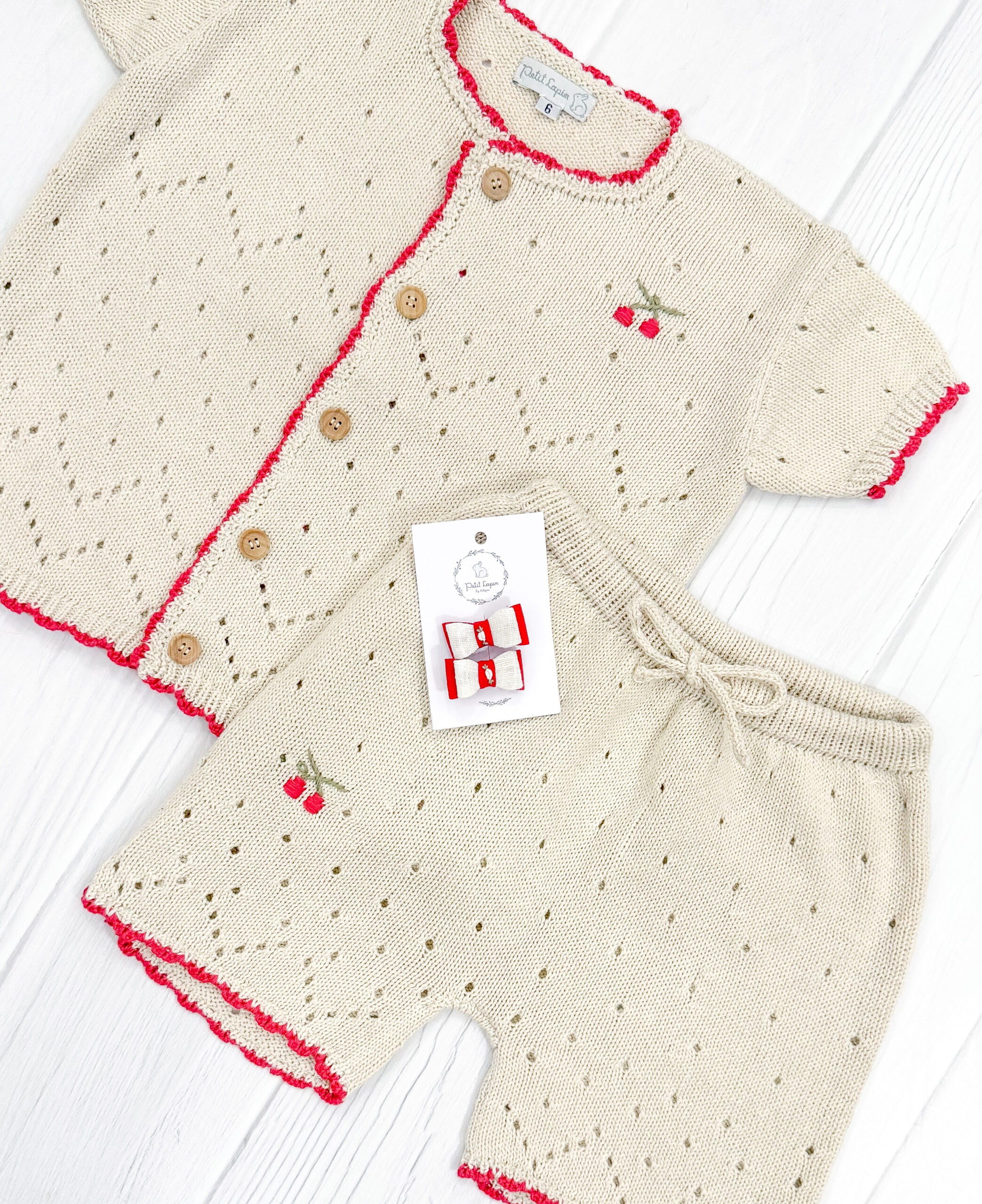 Conjunto de remera y short modelo Cerdeña confeccionado en hilo de algodón 100%. Disponible en beige con vivo rojo y cerezas bordadas a mano, en talles 1-2/2-4/4-6/6-8/8-10 años.