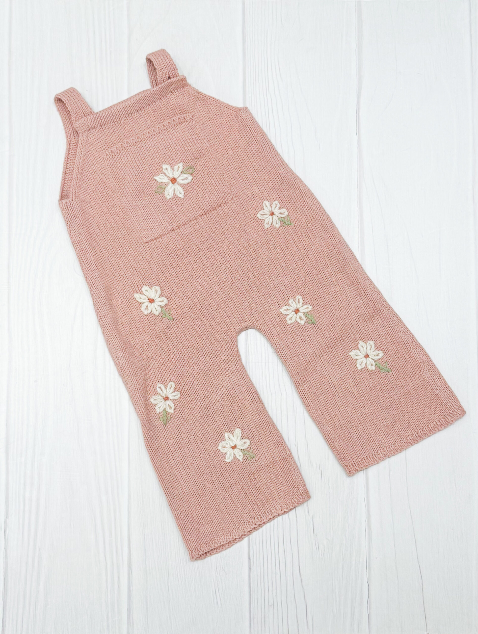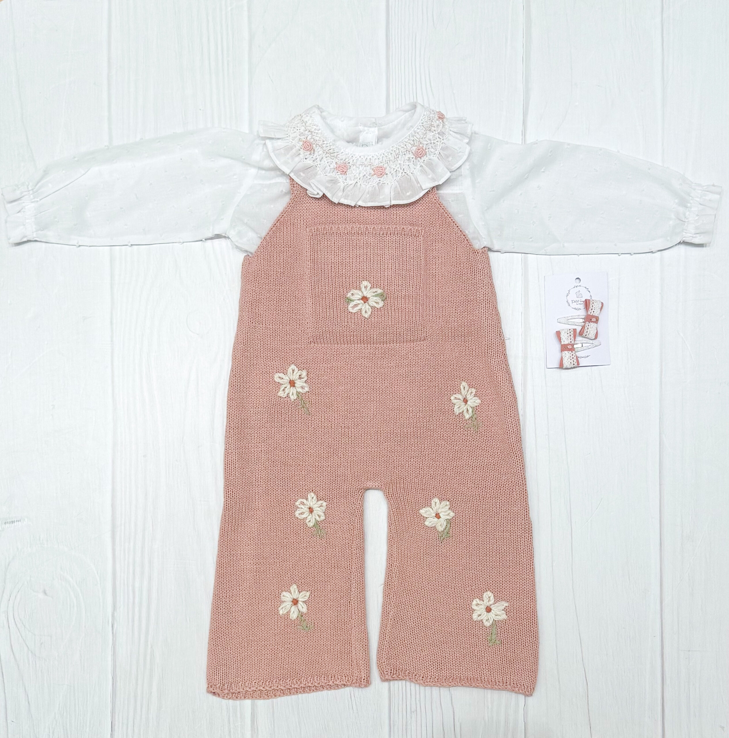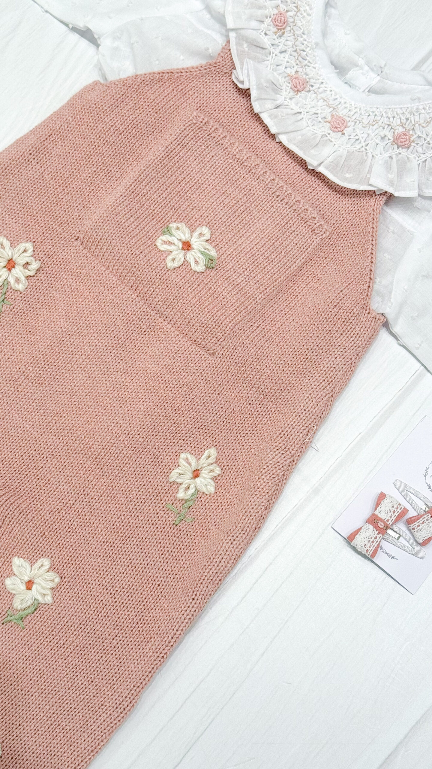 Jardinero tejido en dralon modelo Lourdes, en rosa viejo con apliques de flores.