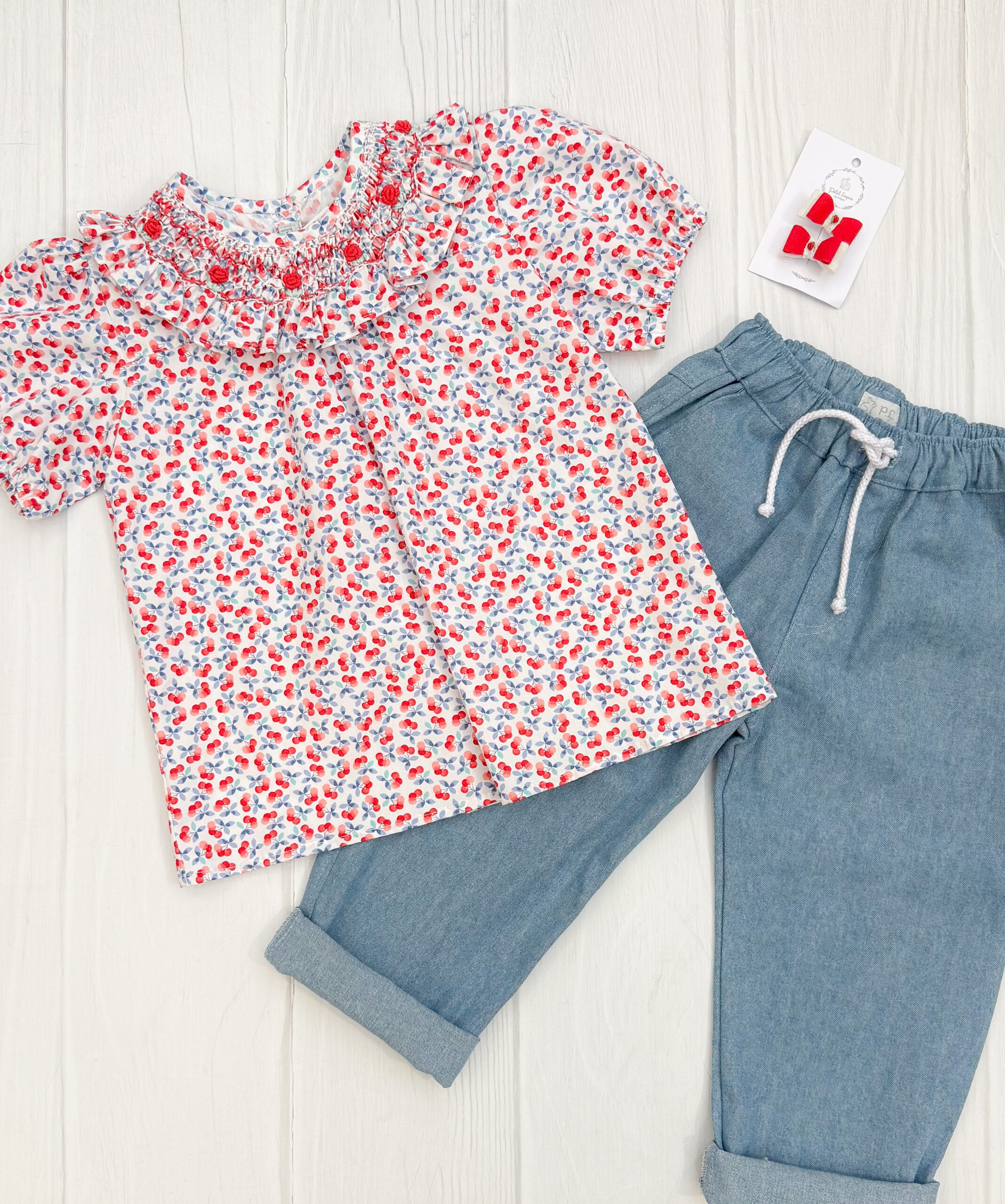 Pantalón de jean de verano 100% algodón, cintura con elástico y terminación recta.