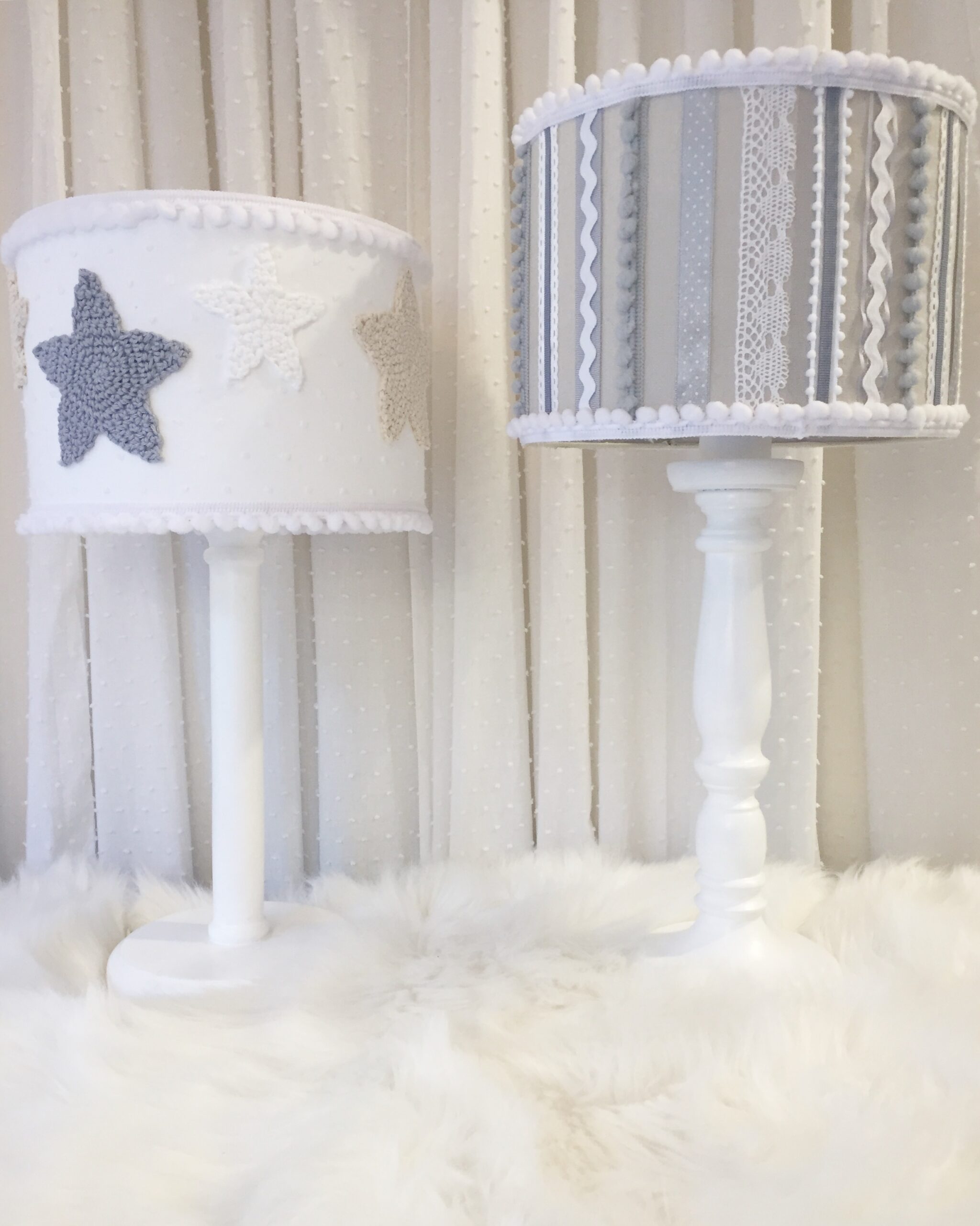 Portátil pie a elección de 48 cm de alto y pantalla cilíndrica de 22 cm de diámetro trabajada con detalles de puntilla, broderie, vainillas y pompones.