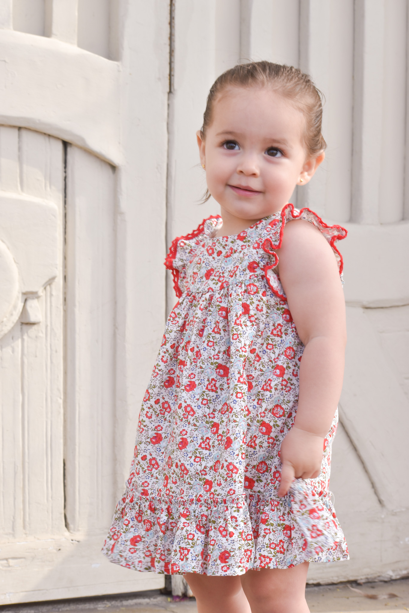 Vestido Andalucía con estampado de flores rojas disponible en talles 3-6/6-12/12-18 meses y 2-4/4-6/6-8/8-10 años.