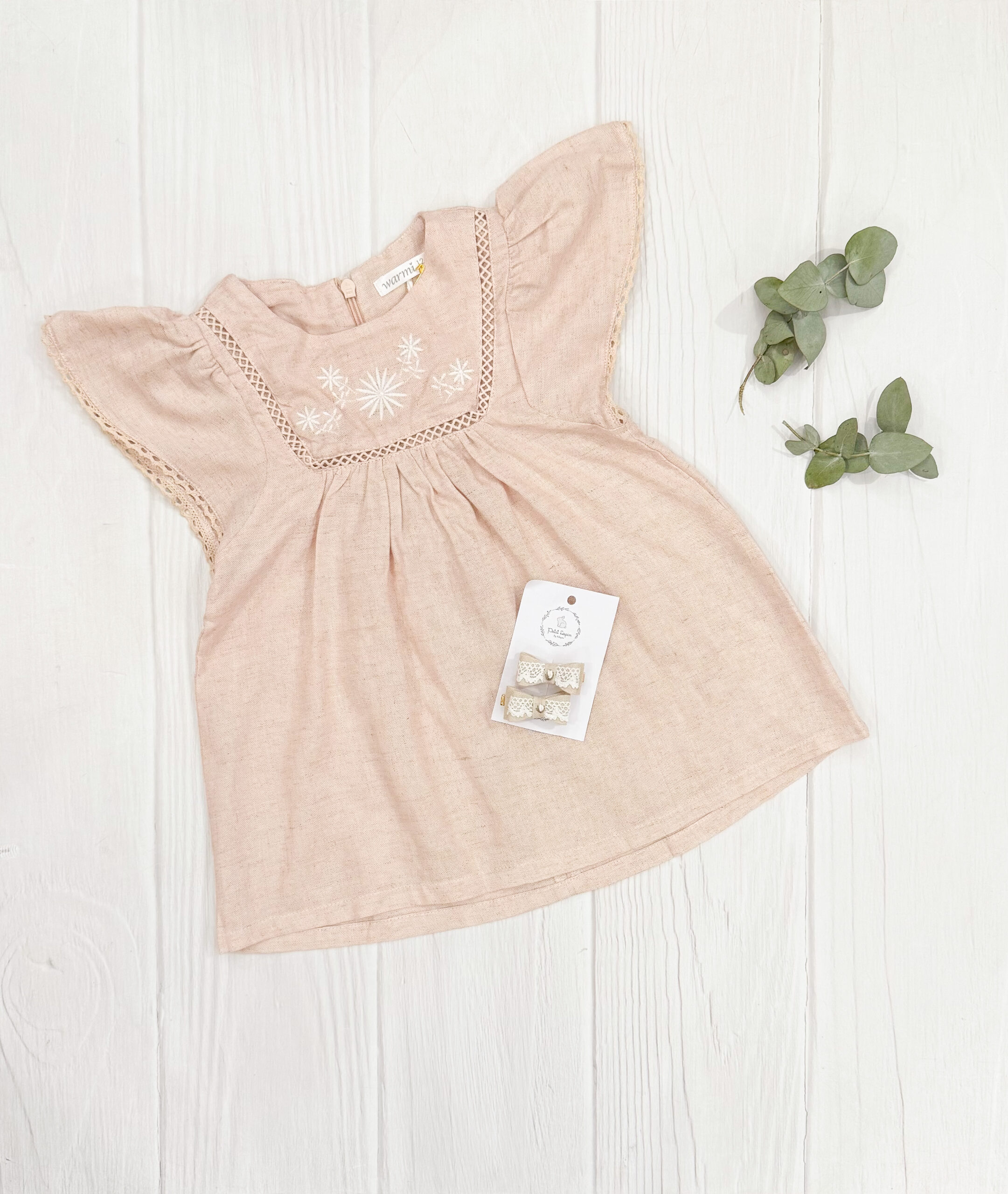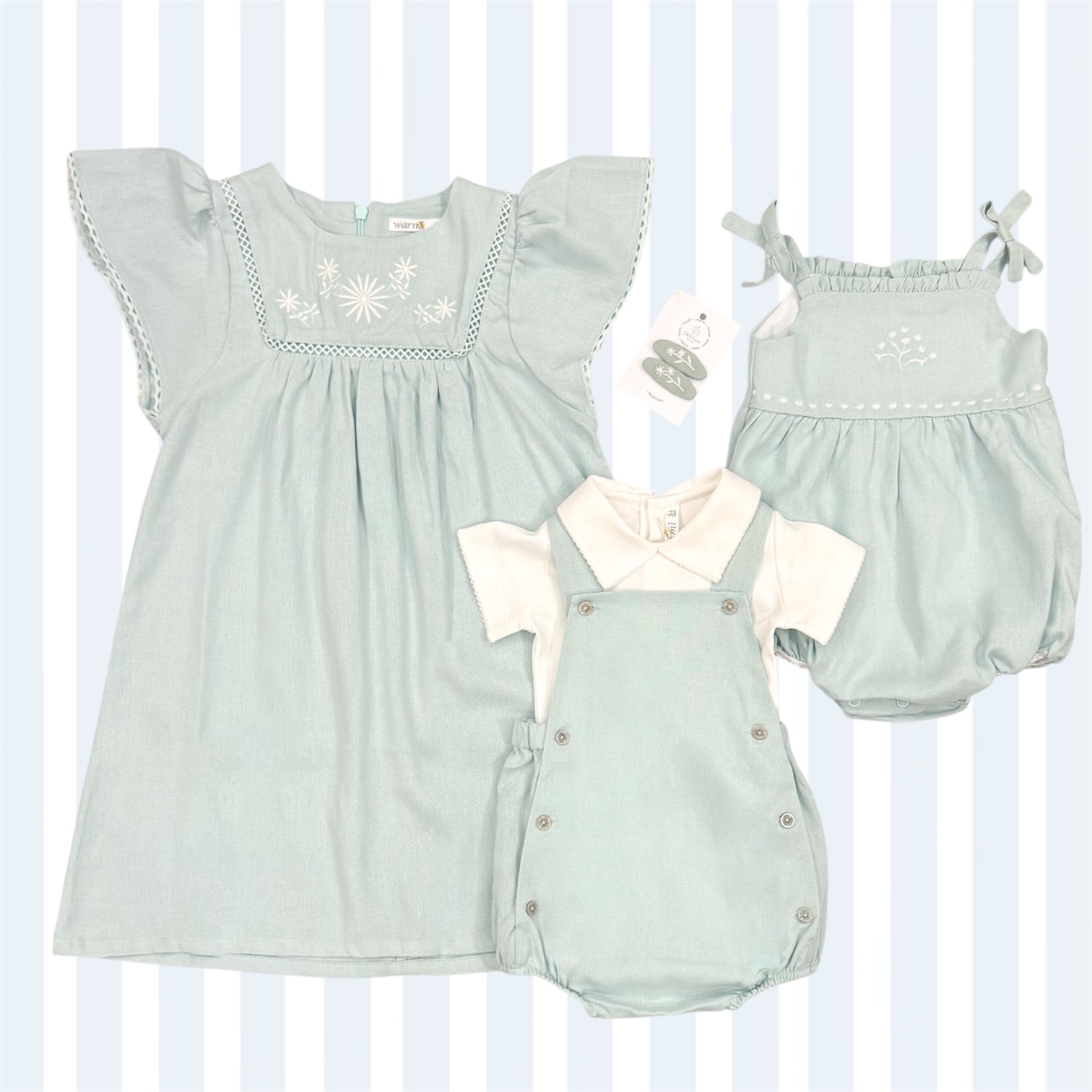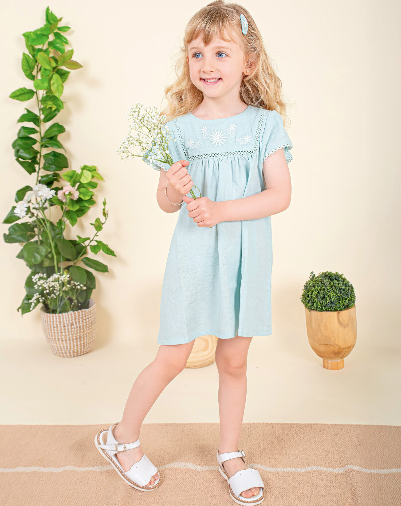 Vestido Elba en lino 100% algodón en color verde menta o rosa jaspeado, disponible en talles 12-18 meses y 2-4/4-6/6-8/8-10 años.