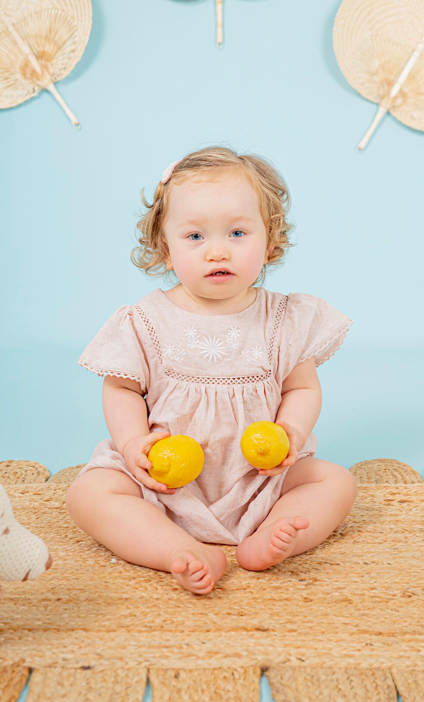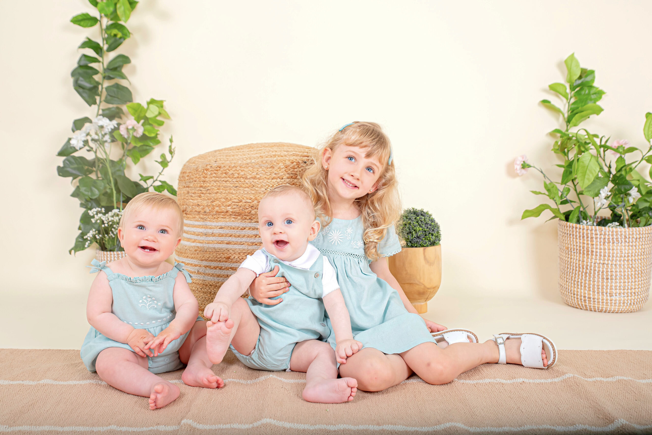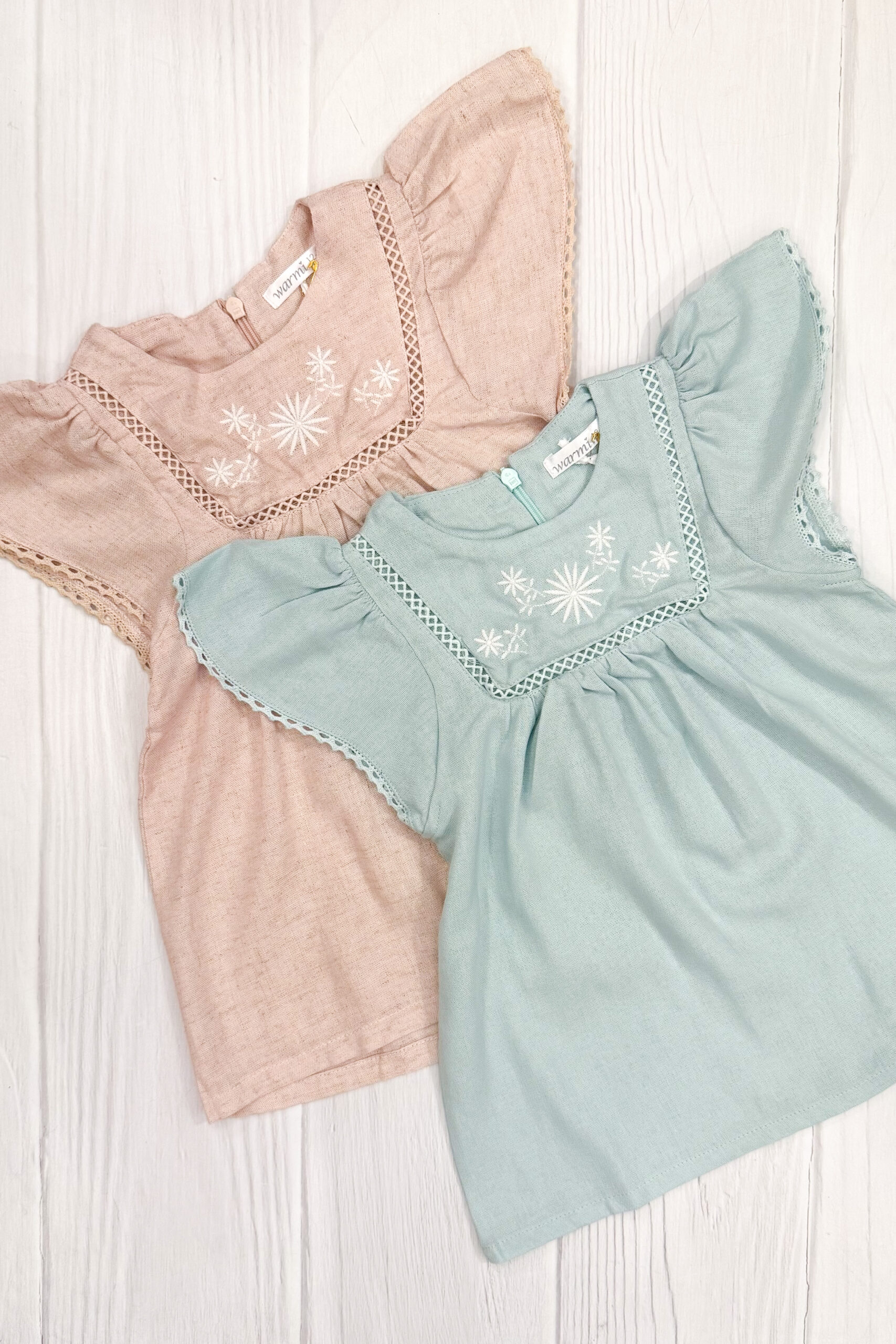 Vestido Elba en lino 100% algodón en color verde menta o rosa jaspeado, disponible en talles 12-18 meses y 2-4/4-6/6-8/8-10 años.