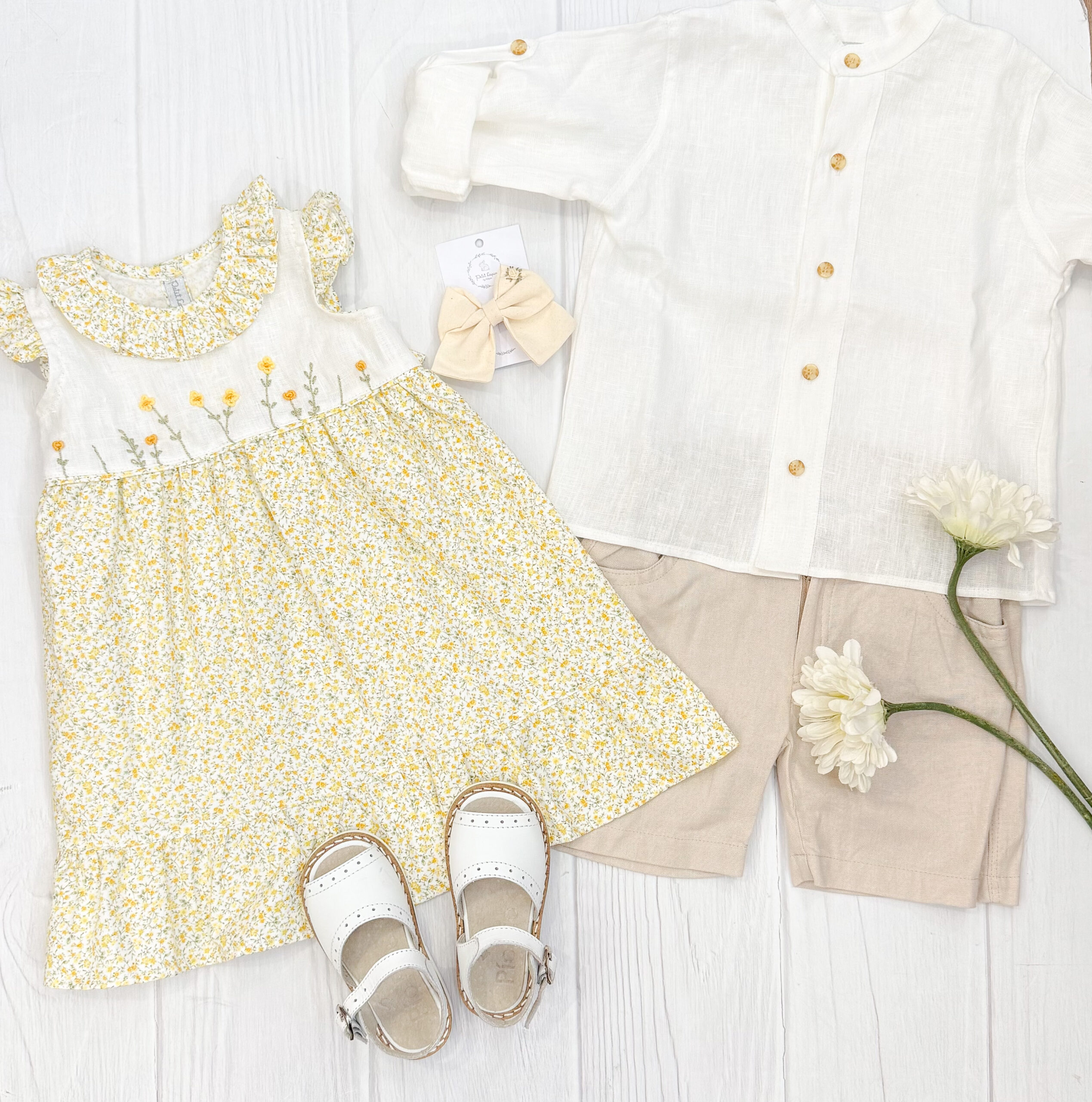 Vestido estampado liberty con amarillo peto bordado de flor disponible de 3-6/6-12 meses y 1-2/2-4/4-6/6-8/8-10 años.