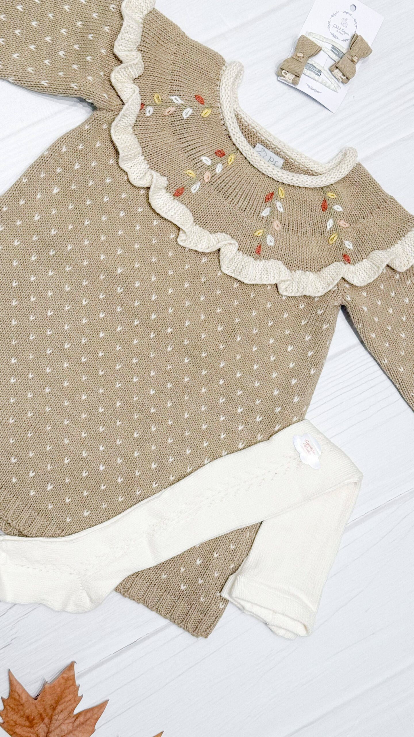 Vestido tejido modelo Felicia con volado y detalles bordados.